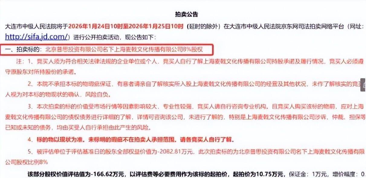 2025-12-31斗鱼,斗鱼直播,斗鱼APP,游戏直播,电竞直播,手游直播,lol直播,英雄联盟直播,dnf直播,cf直播,绝地求生直播,王者荣耀直播,二次元直播,英雄联盟,绝地求生,和平精英,魔兽世界,三角洲2025年12月,大连市中级人民法院的一则拍卖公告悄然上线:王思聪全资控股的北京普思投资有限公司持有的上海麦戟文化传播有限公司8%股权,以10.75万元的起拍价被挂牌法拍。