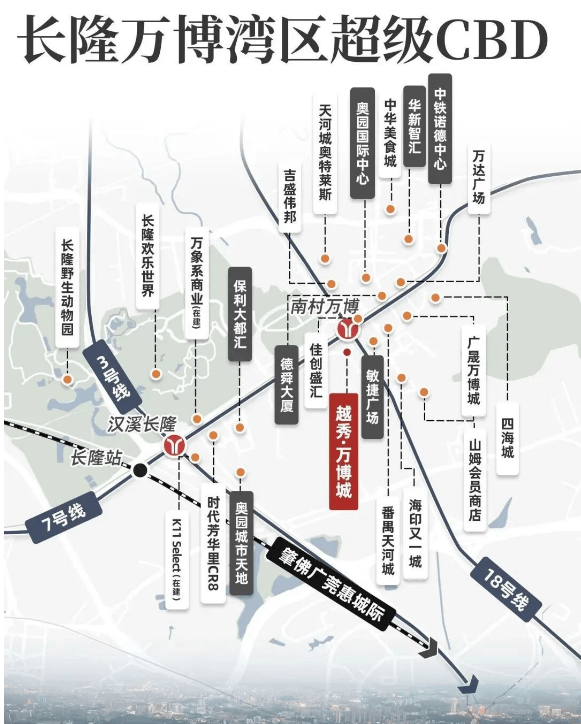 越秀·万博城|和臻落子于番禺长隆万博超级CBD的核心地带。这一区域已聚集超27000家企业,涵盖拼多多、小米互联网、希音、虎牙、欢聚集团等头部互联网平台,形成强大的产业聚集效应。与此同时,长隆旅游度假区年接待游客超4000万人次,在全国主题公园中稳居前列。过去因城中村阻隔,两大经济引擎未能充分联动;但随着去年万博板块正式扩容至7.2平方公里,覆盖长隆及里仁洞片区,整体能级显著提升,甚至超越珠江新城的规模。在此背景下,项目所在位置不仅享有当前成熟的商务与文旅资源,更将长期受益于区域一体化发展的红利。