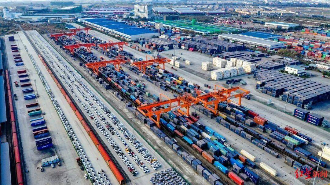 1月1日,成都国际铁路港。一列装载成都玻纤、乐山高品质水泥的西部陆海新通道“蓉桂琼”(成都-钦州-洋浦港)铁海联运班列鸣笛启程,货物将经广西钦州港,再海运转至海南洋浦港出境;