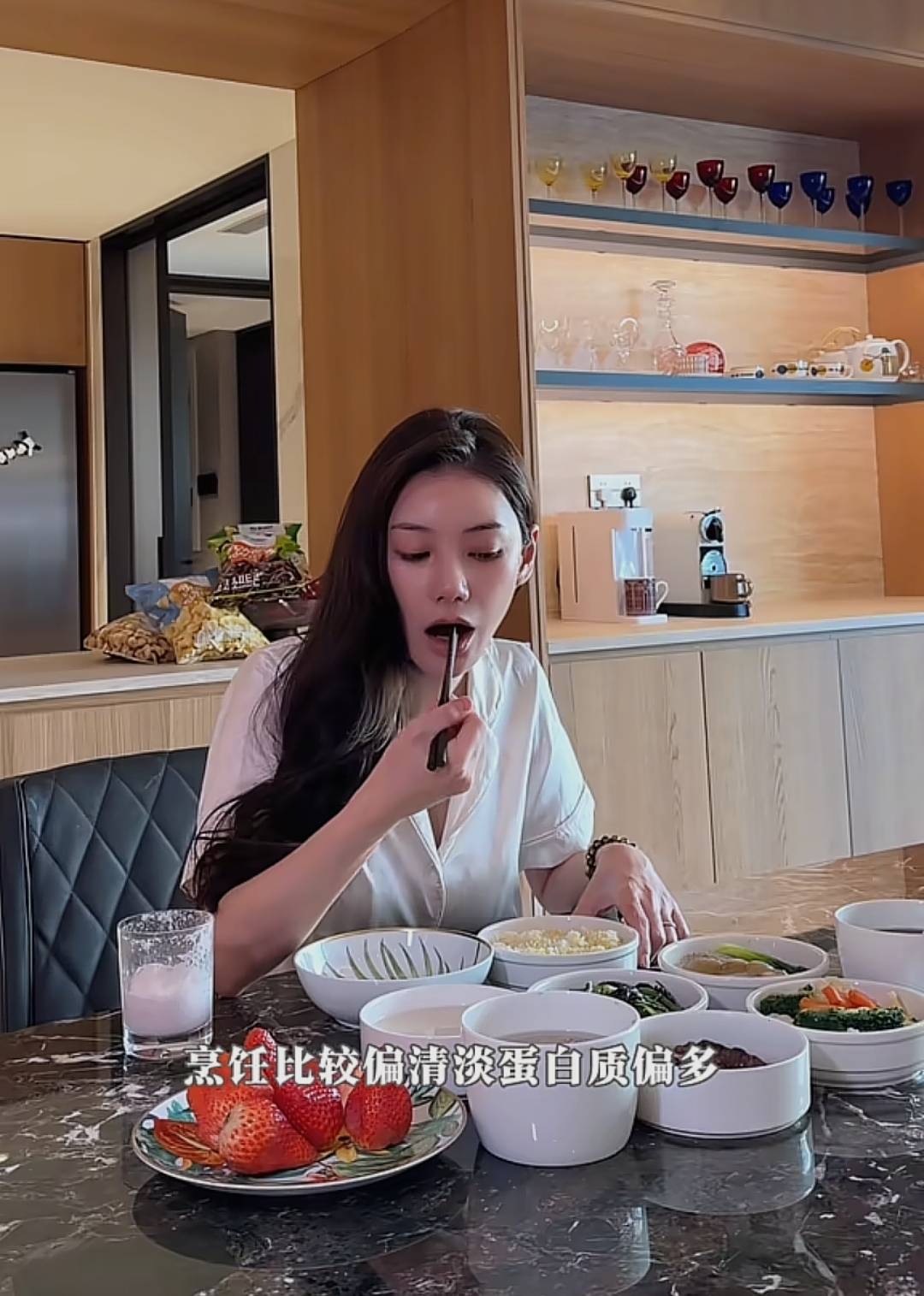在她日常的饮食安排上,也看得出是被精心呵护着。有一次,她一个人用餐,餐桌上就摆放着数量可观的碗碟,里面有五道菜肴,搭配三种汤品,此外还有一份新鲜的水果。这样的配置,对于孕期的营养补充来说,无疑是相当丰盛的。